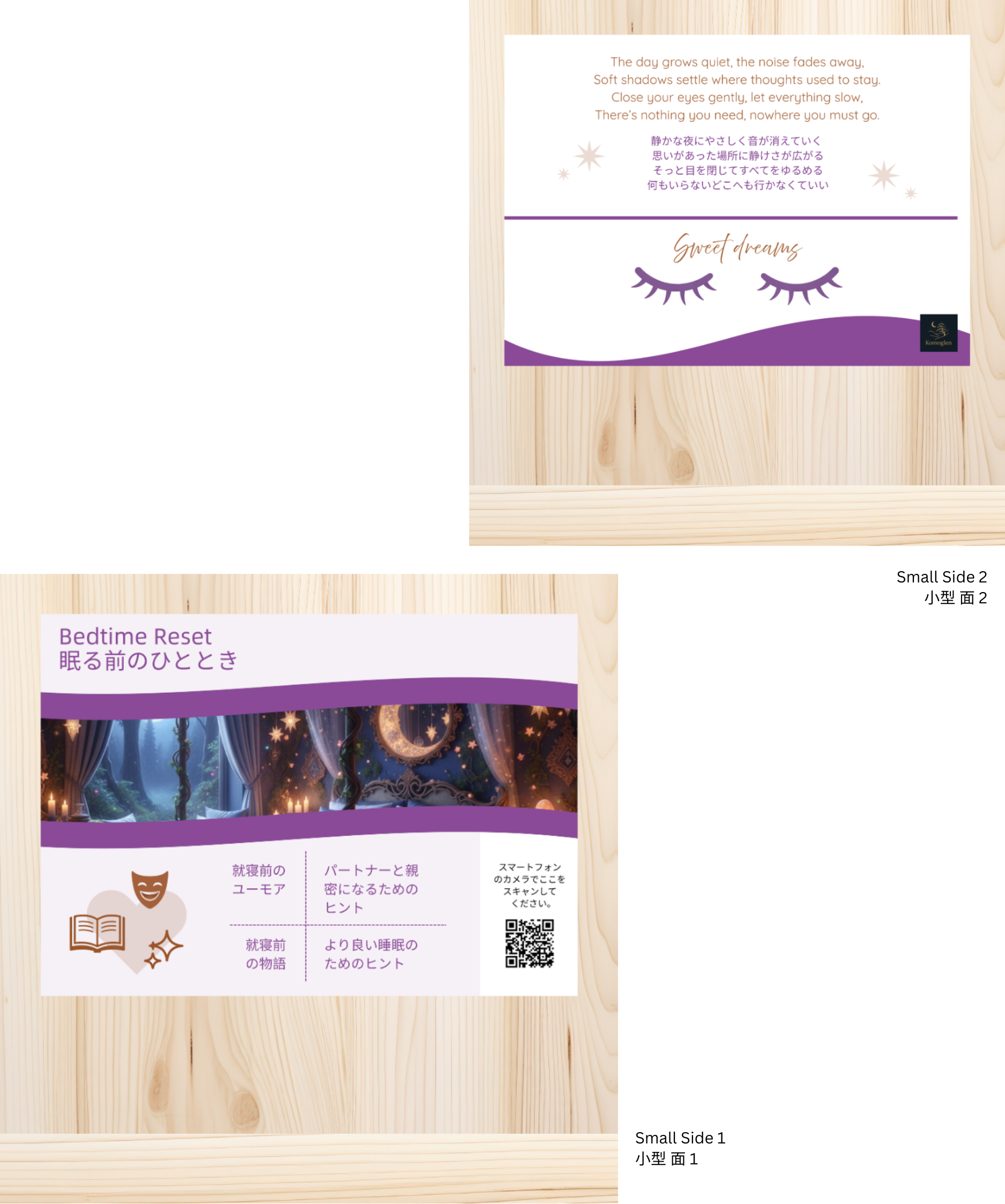 A wooden card holder designed for women/couples to place on a bedside table or shelf, helping them reconnect and gently reset before sleep.